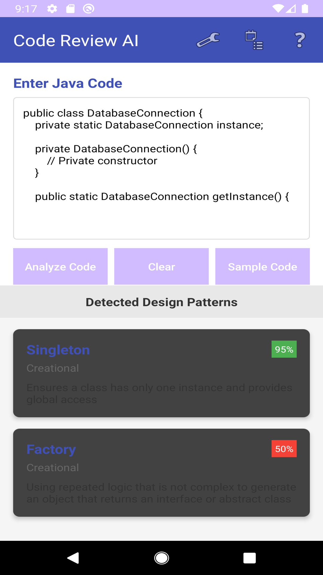 Analyzes your code for architectural patterns, design patterns, and quality.