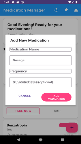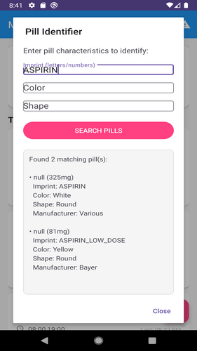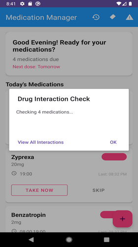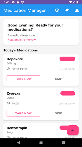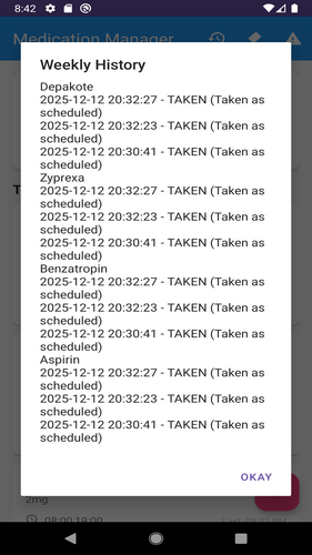 Enter your medication and it will give you a history of taking them over the week and allow you to show your doctor your medications without having to bring your pill bottles around in case you forget the names or dosages.