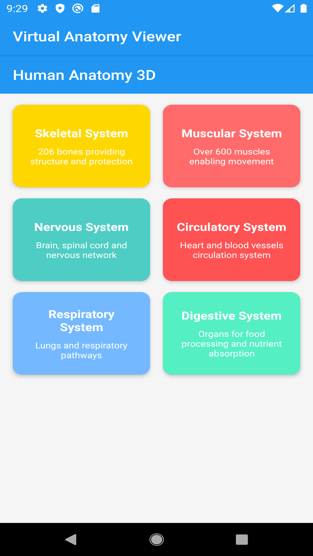 See the circulatory, respiratory, nervous, muscular, skeletal, and digestive systems in 3D on an Android Human.