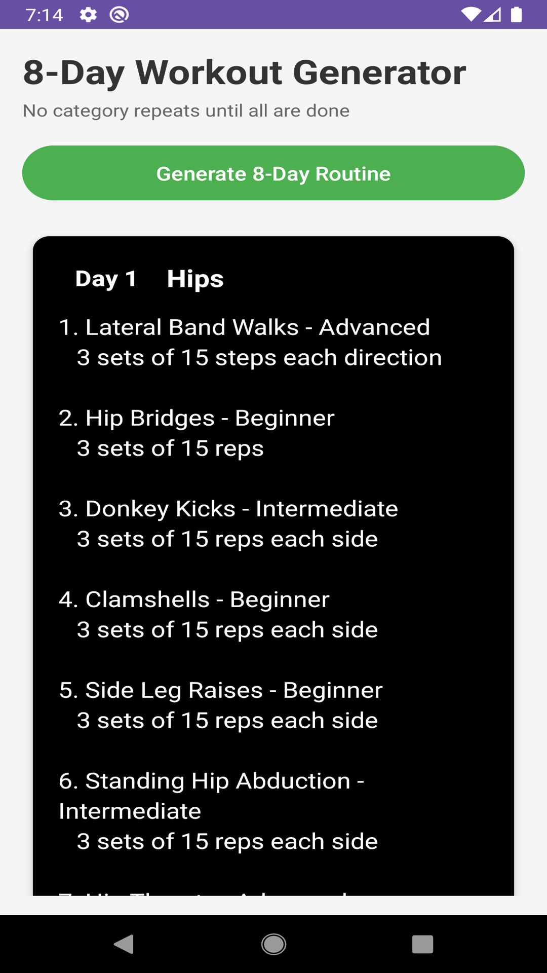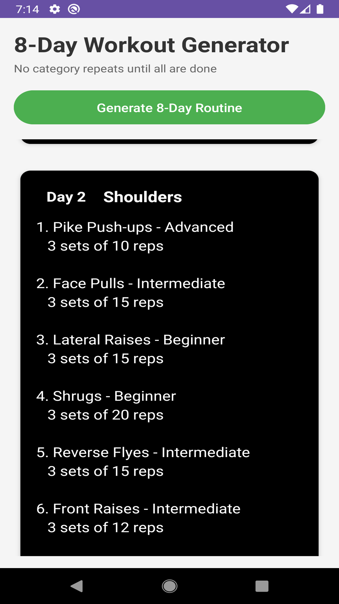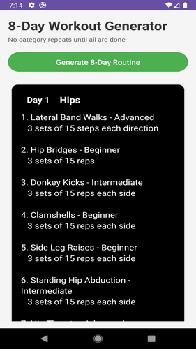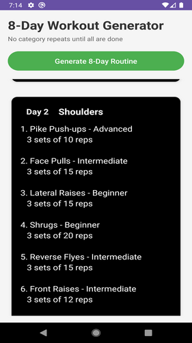 Generate workout plans with categories and exercise thereby working on a new area of the body each day.